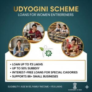Entrepreneurs. The poster should have a title ‘UDYOGINI SCHEME’ at the top. It should feature high-quality images of women engaged in diverse businesses like tailoring, catering, and handicraft. Key highlights to include in text: ‘Loan up to ₹3 Lakhs’, ‘Up to 50% Subsidy’, ‘Interest-Free Loans for Special Categories’, ‘Supports 88+ Small Businesses’. The color theme should be professional (teal, gold, and white). Include a symbolic logo of women empowerment and the Government of India style emblem. The layout should be modern and easy to read.”