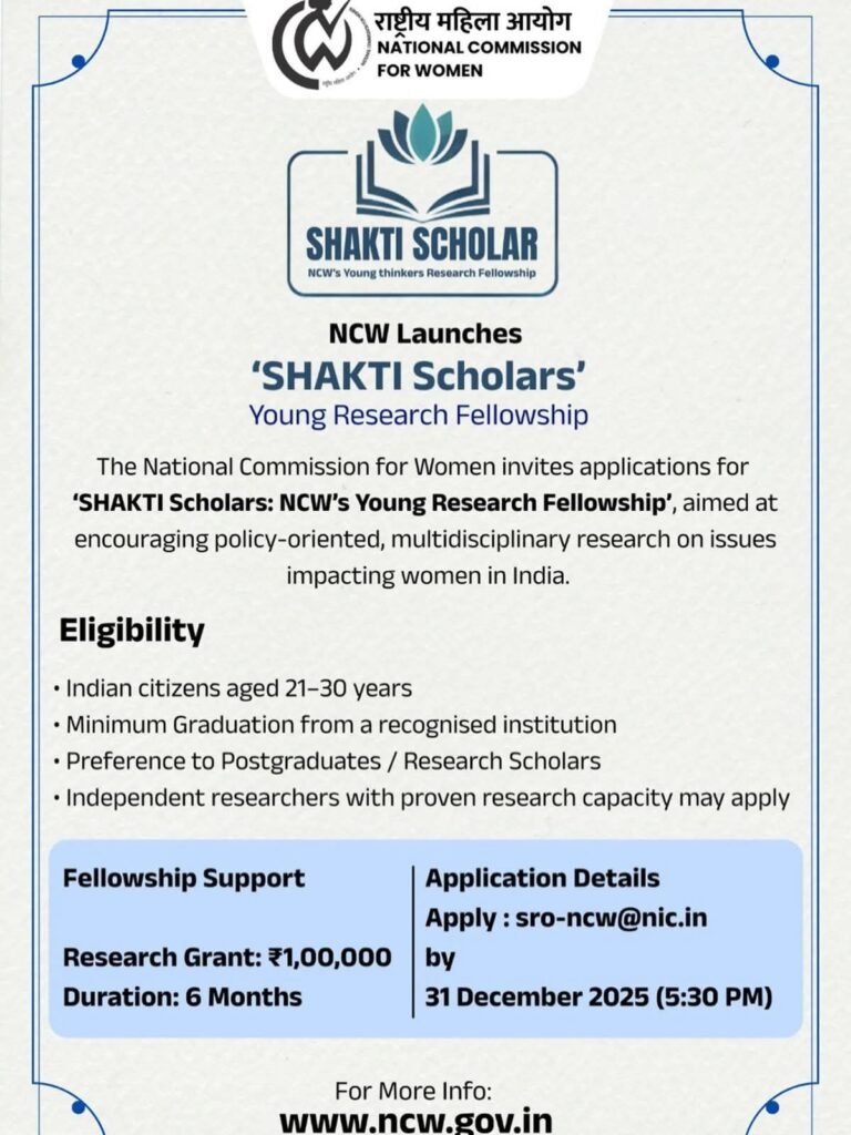 The National Commission for Women invites applications for ‘SHAKTI Scholars: NCW’s Young Research Fellowship’, aimed at encouraging policy-oriented, multidisciplinary research on issues impacting women in India.