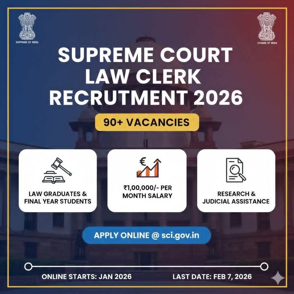 Disclaimer: The information provided in this article is for informational purposes only. For all the latest information and updates regarding the Supreme Court Law Clerk Recruitment 2026: Apply Online for 90+ Vacancies, please visit the official website (sci.gov.in). The terms and conditions of the recruitment may change from time to time. Please check all the eligibility criteria and documents before applying.