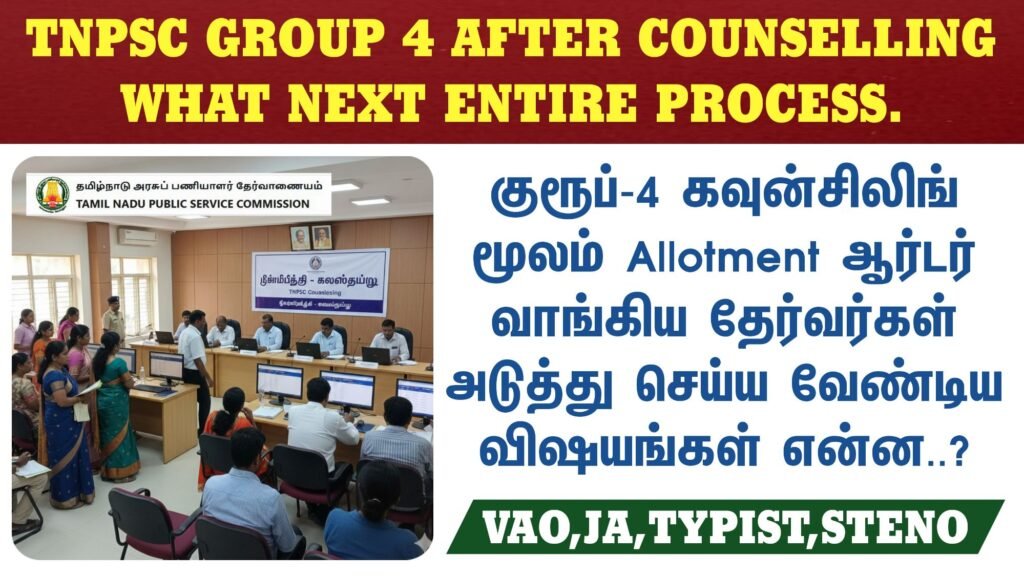 2025 ஆம் ஆண்டில் நடைபெற்ற டிஎன்பிஎஸ்சி குரூப் 4 தேர்வில் வெற்றி பெற்ற தேர்வுகள் டிஎன்பிஎஸ்சி மூலம் நடத்தப்பட்ட கவுன்சிலிங் போஸ்டிங் வாங்கியவர்கள் அடுத்து செய்ய வேண்டிய விஷயங்கள்.